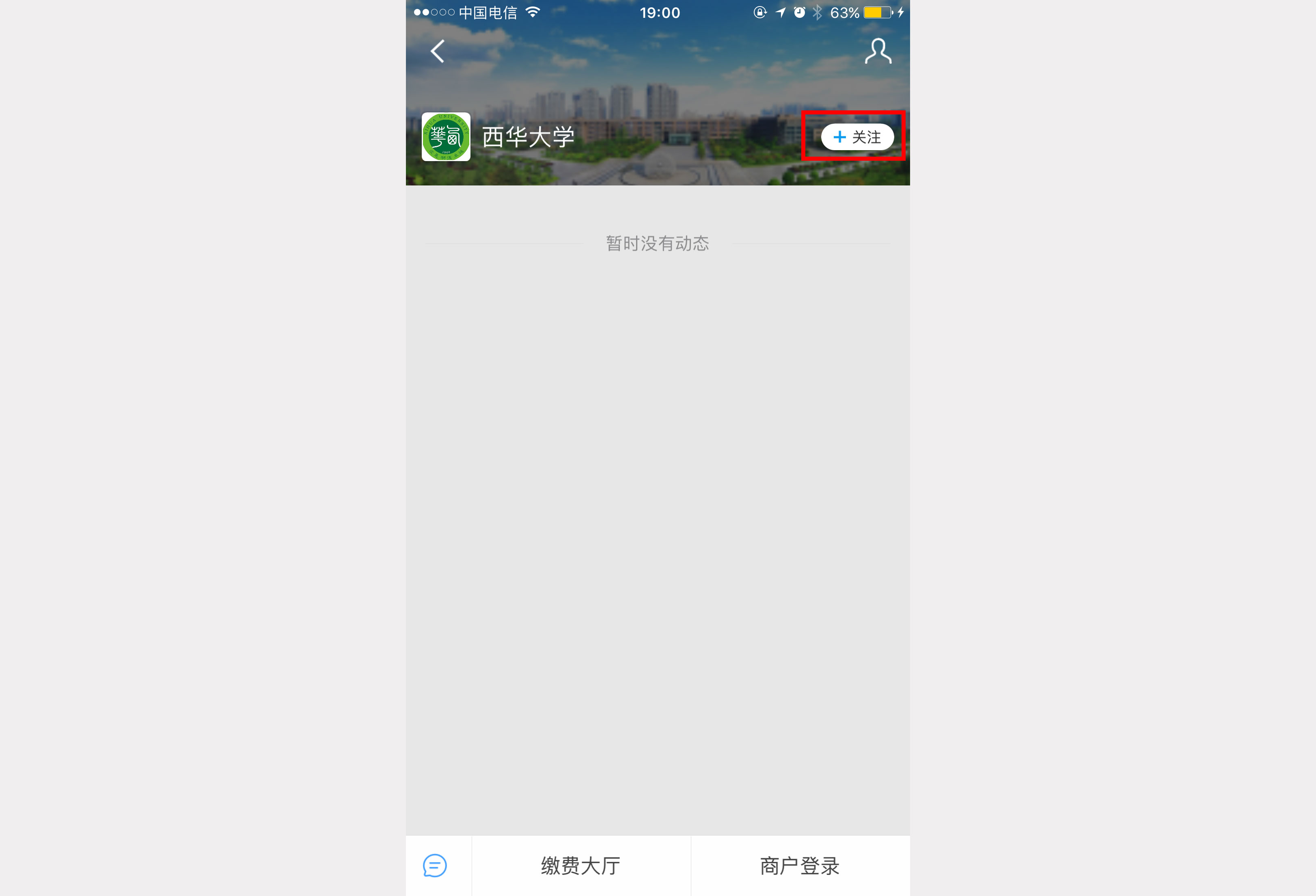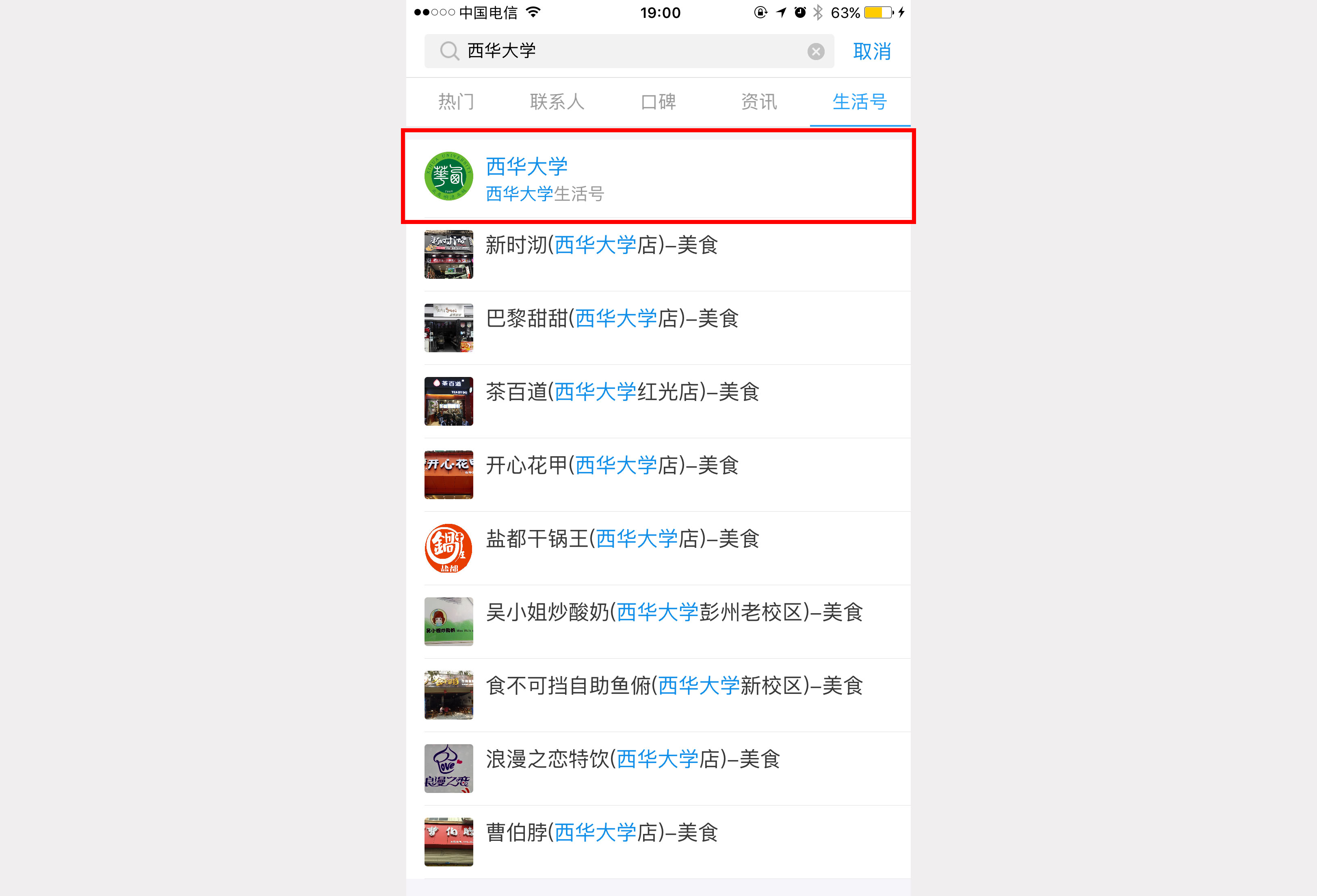 1.2、 从搜索结果中选择西华大学生活号,点击进入