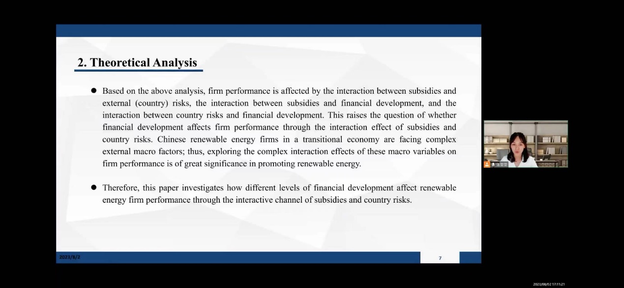 2023年8月4日,第三届互联网金融与数字经济国际学术会议(The 3rd International Conference on Internet Finance and Digital Economy,ICIFDE 2023)在线上召开。管理学院会计与财务系教师张雯雯博士参会学习并作 《The Dynamic Threshold Effect of Financial Development on the Country Risks – Subsidies – Firm Performance Nexus: Evidence from Chinese Renewable Energy Firms》论文汇报交流。