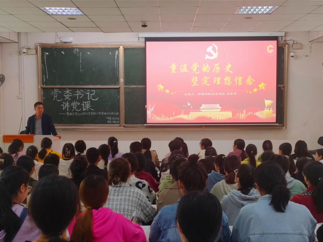 为重温中国共产党走过的波澜壮阔的历程,进一步坚定同学们的理想信念202310131210,388vip太阳集团党委书记肖东华为入党积极分子们在教室4A-104讲授“重温党的历史,坚定理想信念”专题党课。管理学院入党积极分子培训班指导教师彭柳,管理学院2023年秋季学期入党积极分子培训班全体干部及学员到场参加本次党课学习。