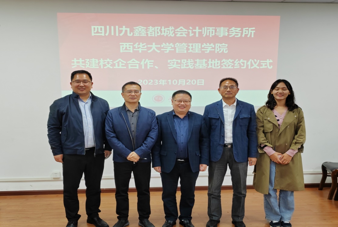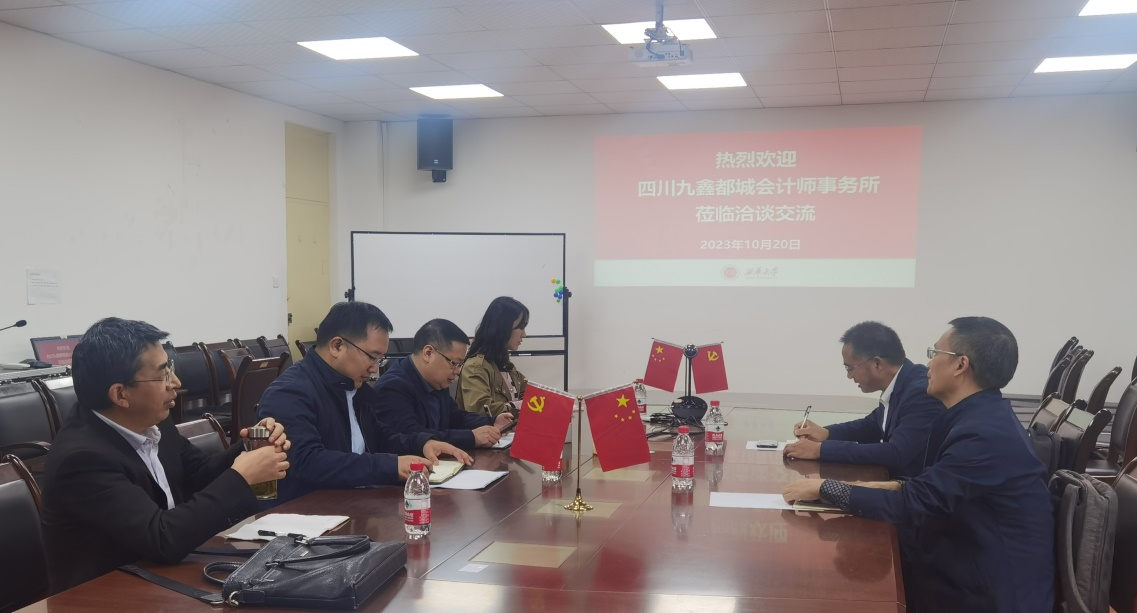 2023年10月20日上午,受388vip太阳集团邀请,四川九鑫都城会计师事务所负责人荣智慧先生、运营总经理邵春辉先生等莅临管理学院进行合作洽谈。管理学院副院长姚世斌、工商管理系主任丁灿、会计与财务系副主任张雯雯,工商管理系老师徐武明参加了此次洽谈会。