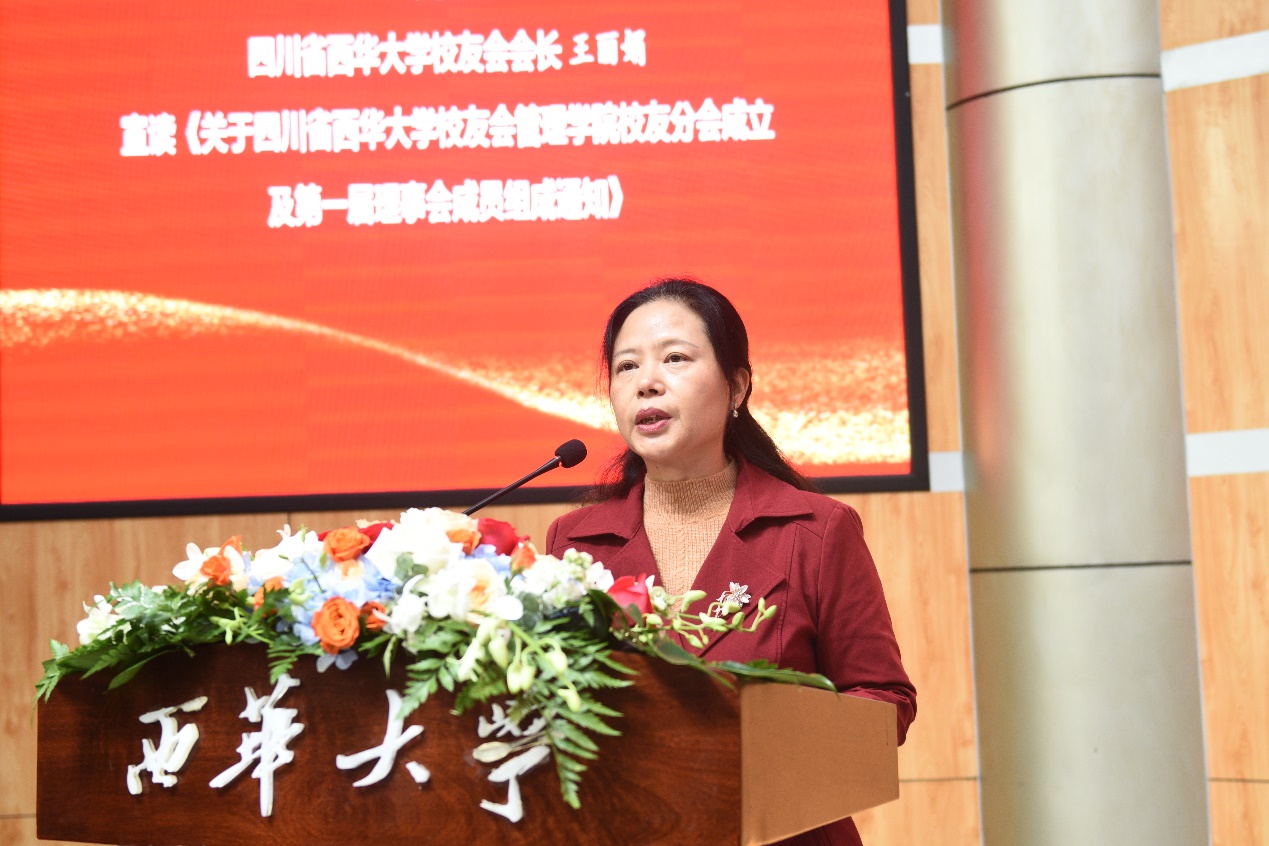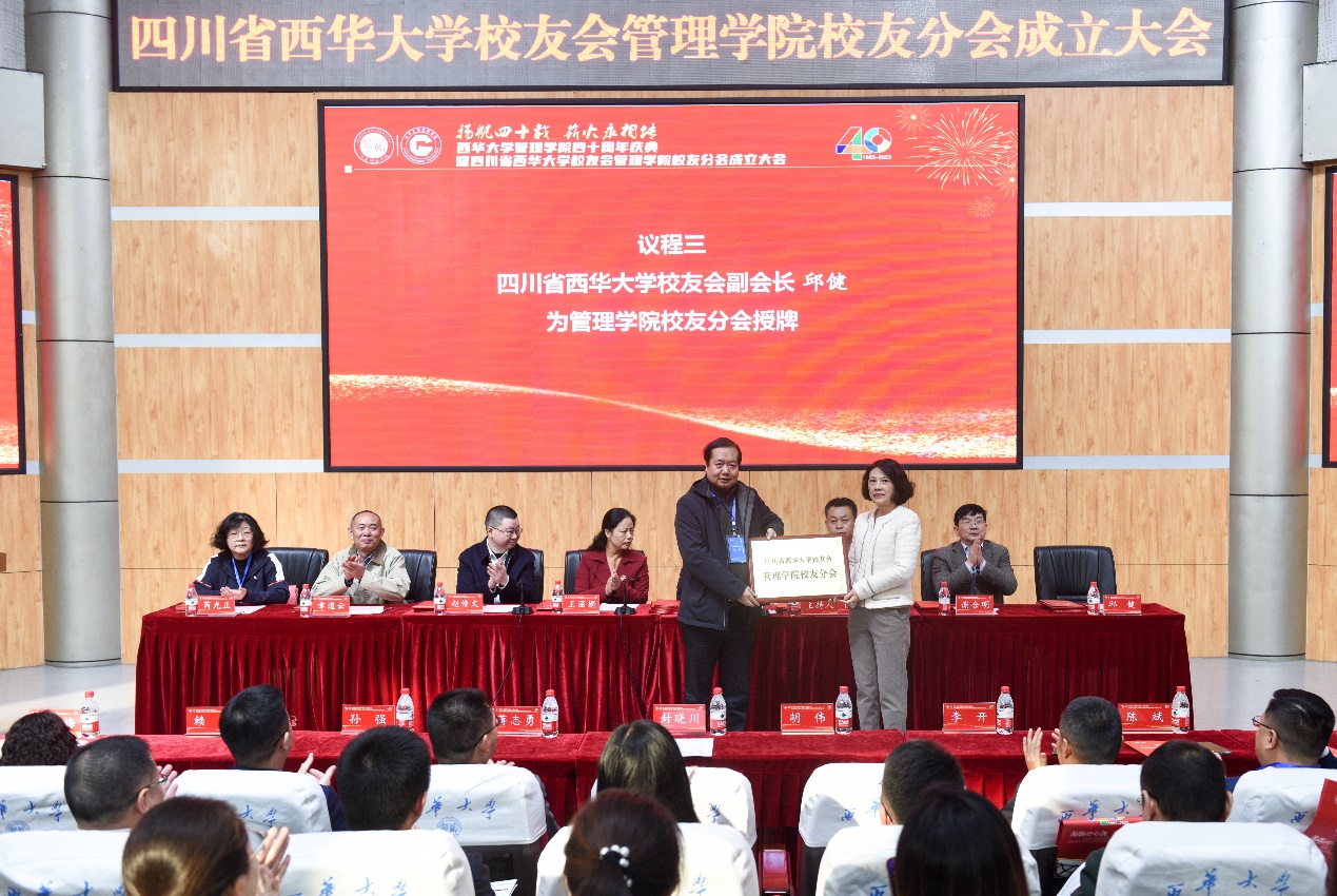 西华大学校友会会长王丽娟宣读《关于四川省西华大学校友会管理学院校友分会成立及第一届理事会成员组成通知》文件。四川省西华大学校友会副会长邱健为管理学院校友分会授牌。随后,主席台领导、嘉宾为第一届理事会成员颁发了聘书。