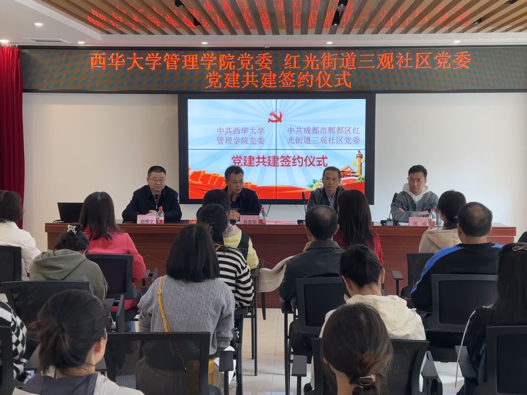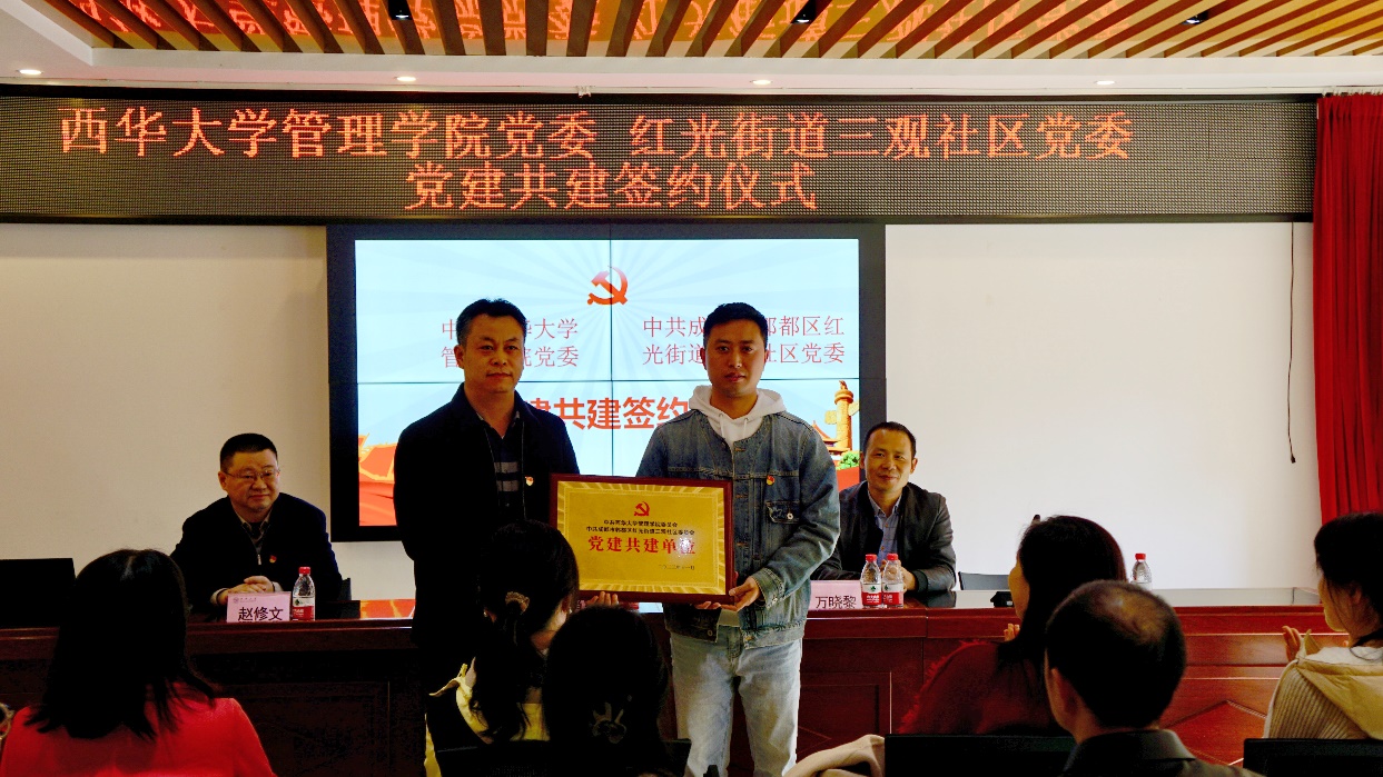 为不断深化校地合作,充分发挥高校人才资源优势,进一步强化党建引领基层治理,拓展高校基层党建工作新渠道,赋予基层社区治理新动能,推动高校与社区联建聚合力、共建促发展,2023年11月23日管理学院党委与郫都区红光街道三观社区党委举行党建共建签约仪式。管理学院党委书记肖东华,院长赵修文,郫都区红光街道党工委副书记万晓黎,三观社区党委书记周成等出席签约仪式。