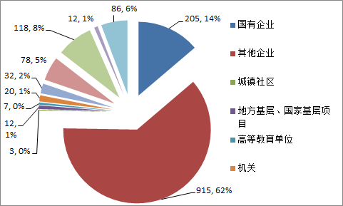 | 单位性质 | 国有企业 | 其他企业 | 城镇社区 | 地方基层、国家基层项目 | 高等教育单位 | 机关 | 其他事业单位 | 三资企业 | 出国出境及升学 | 自主创业 | 未就业 | 合计 |