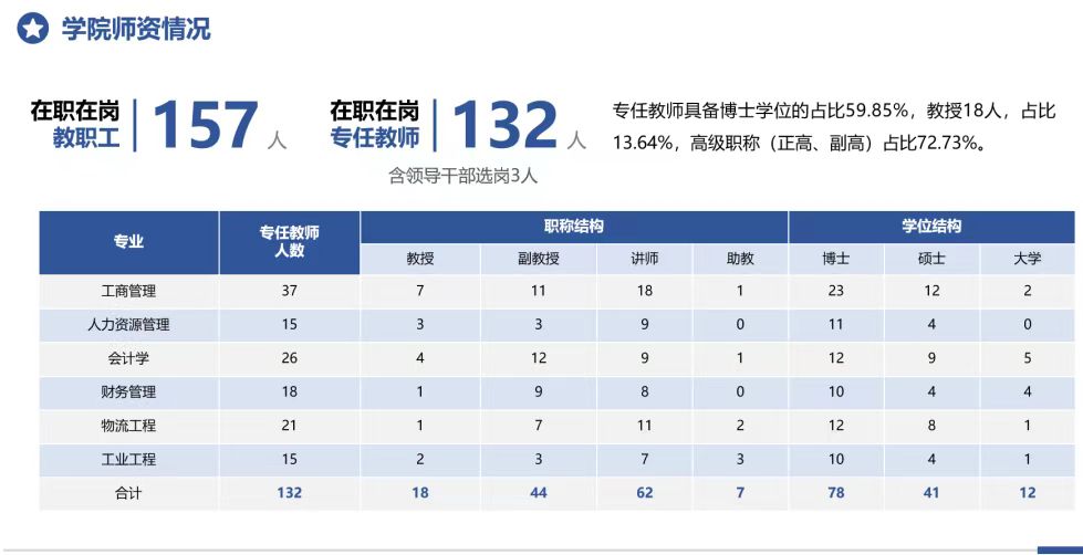 管理学院始建于1983年。学院拥有“工商管理”一级学科硕士学位授权点,会计(MPAcc)、项目管理、工业工程与管理、物流工程与管理专业学位硕士点。2024年本科招生专业有工商管理、人力资源管理、会计学、财务管理、工业工程、物流工程。其中,工商管理和会计学为国家级一流本科专业建设点。