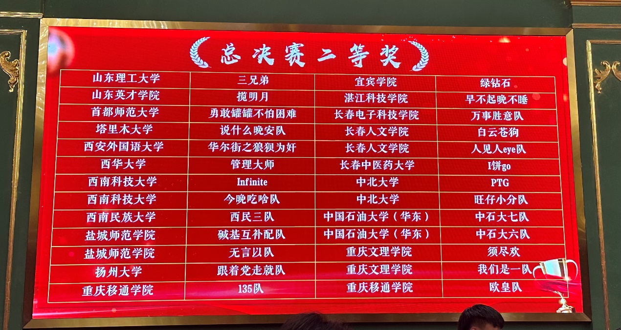 在全国总决赛中,我院由孙菊爽、黄媛媛、周俊阳组成的“管理大师”队,在崔宣、何星星老师的指导下,荣获全国二等奖;由刘洪志、李治平、田津瑞组成的“稆頗队”与杨明子、罗浩、王翔组成的“吴彦组”队,在何星星、杨雪怡、孔祥芳老师的指导下荣获全国三等奖。我校在本次比赛中被评为“优秀组织单位”。