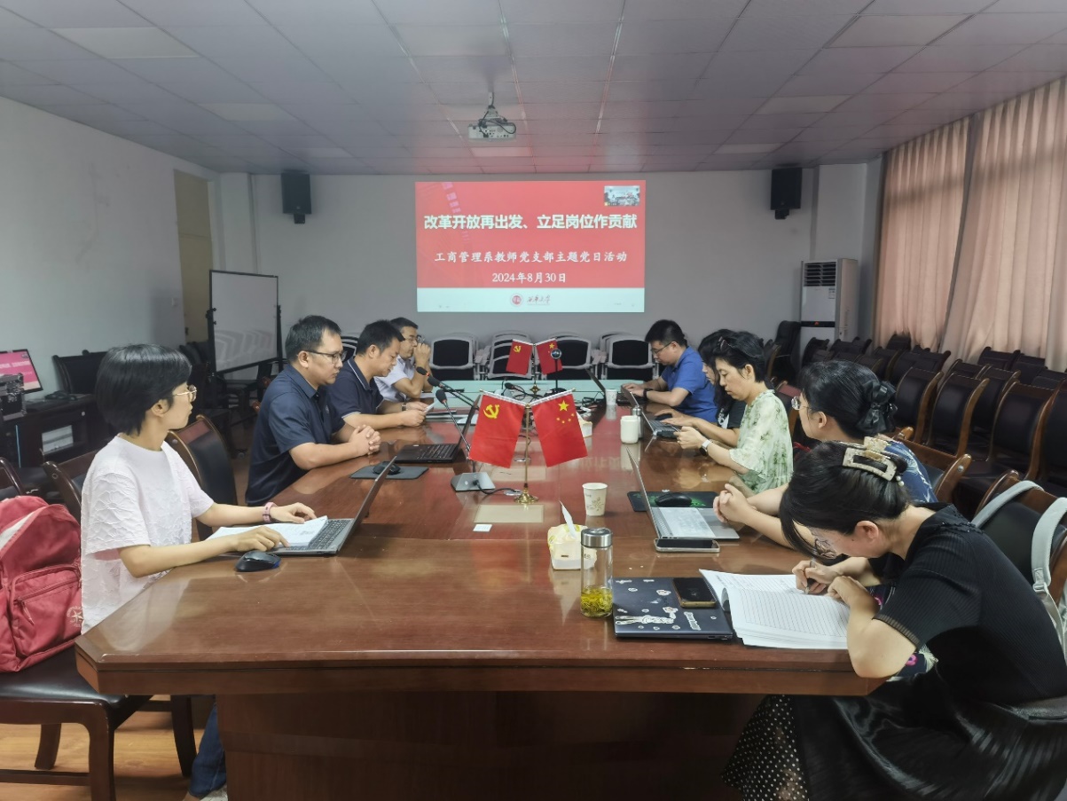 2024年8月30日,管理学院工商管理系教师党支部通过“线上+线下”会议形式,开展了以“改革开放再出发、立足岗位做贡献”为主题的党日活动。支部全体教师党员参加活动,会议由党支部书记丁灿主持。