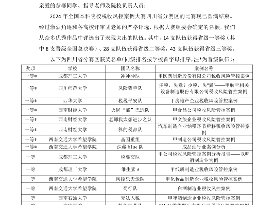 在2024年11月2日结束的2024年全国本科院校税收风险管控案例大赛四川省赛中,管理学院学子共斩获了8个奖项,其中一支队伍晋级全国总决赛。“全国本科院校税收风险管控案例大赛”属国家级竞赛,是目前全国本科院校财税领域最具影响力的赛事之一。
