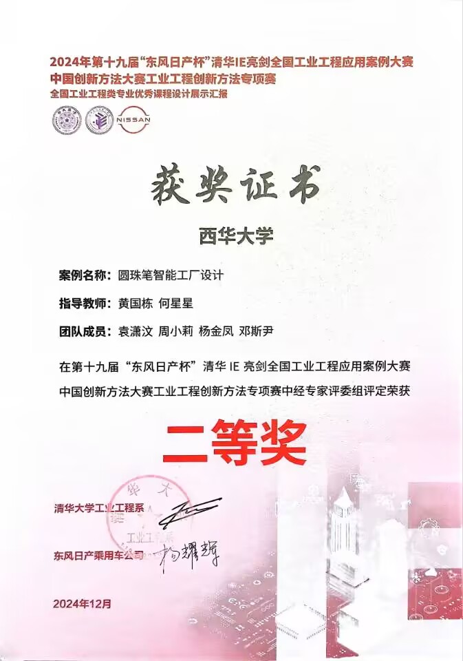 近日,由教育部高等学校工业工程类专业教学指导委员会在全国高校组织开展的“工业工程类专业优秀课程设计展示”活动成绩揭晓,由我校工业工程专业学生袁潇汶、周小莉、杨金凤、邓斯尹所提交的《圆珠笔智能工厂设计》课程设计作品成功入围总决赛,指导教师为黄国栋和何星星老师。入围该设计题目决赛的参赛院校还有上海交通大学、南京大学、北京交通大学等全国知名高校,我校是唯一入围的省属院校参赛队伍。经过线上比拼,管院工业工程学子荣获全国二等奖。