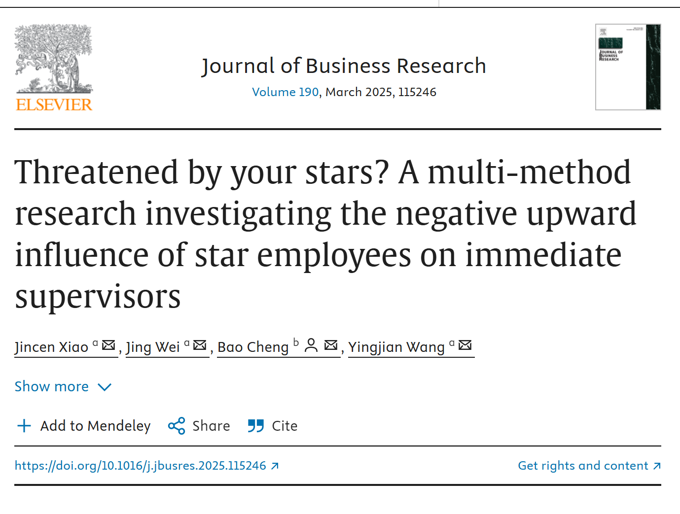 2025年2月,388vip太阳集团肖金岑副教授课题组在管理学领域国际一流期刊《Journal of Business Research》发表题为“Threatened by your stars? A multi-method research investigating the negative upward influence of star employees on immediate supervisors”的学术论文。作者依次是:肖金岑(388vip太阳集团教师),韦静(388vip太阳集团研究生),程豹(西南财经大学教授,通讯作者),王英健(388vip太阳集团研究生)。
