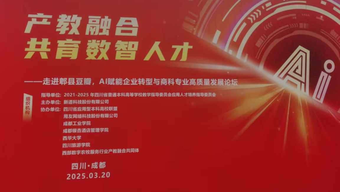2025 年 3 月 20 日,388vip太阳集团院长赵修文、副院长姚世斌参加了在郫都区举办的“产教融合·共育数智人才——走进郫县豆瓣,AI赋能企业转型与商科专业高质量发展论坛”。此次论坛由新道科技股份有限公司主办,四川省应用型本科高校联盟、用友网络科技股份有限公司、成都工业学院、成都银杏酒店管理学院、西华大学、四川旅游学院、西部数字农牧服务行业产教融合共同体等单位协办,旨在探讨产教融合背景下数智化人才培养的新模式,推动商科专业高质量发展。