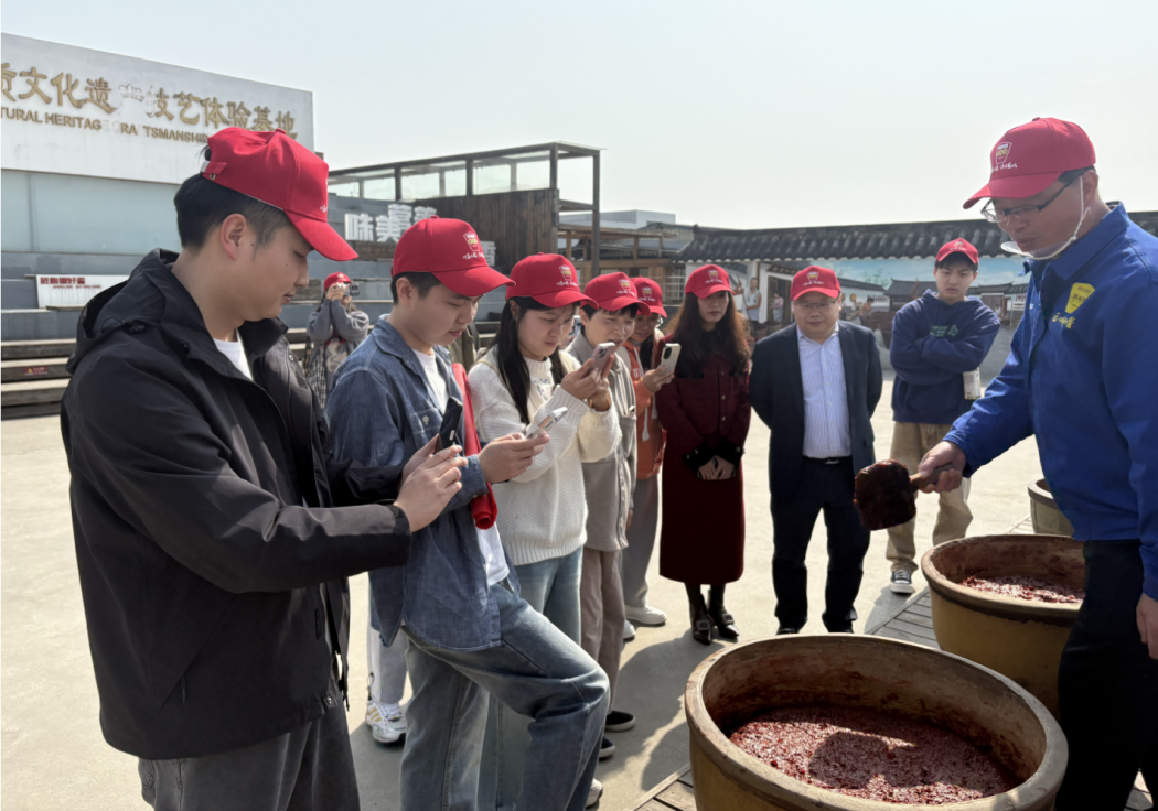 四川郫县豆瓣股份有限公司是西南地区历史悠久的规模化豆瓣酱生产企业。公司作为中国非物质文化遗产郫县豆瓣传统制作技艺的传承企业,是郫县豆瓣行业龙头企业及行业标准化生产示范工厂。姚世斌一行在公司高管、校友韦倩岚的带领下参观了公司智能化生产车间,深入了解了郫县豆瓣从手工酿造到智能生产的转型历程,以及豆瓣酱制作过程的数智化管控。参观人员亲自体验了传统豆瓣的翻晒工艺。随后参观了企业历史展馆,详细了解了公司的企业文化、发展历程和未来规划。