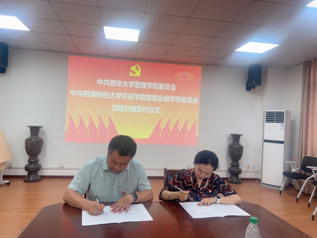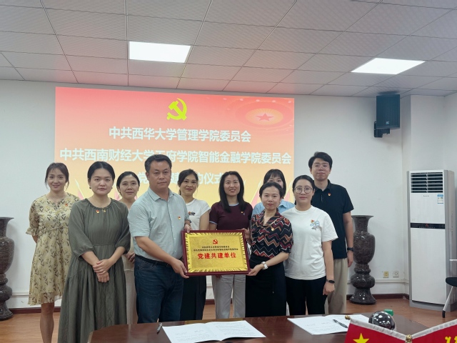 管理学院党委书记肖东华和西财天府智能金融学院副书记刘秀分别介绍了学院党委具体情况,与会人员围绕师资互补、科研合作等党建共建相关工作进行了交流。双方表达了希望通过共建更好地促进发展的美好愿望,希望以此次共建为契机,加强两校间的学习交流,共同探讨党建工作的好方法、好经验,增强针对性和实效性,推动各项工作发展,取得良好成绩。随后双方签约了党建共建协议书并进行了授牌仪式。