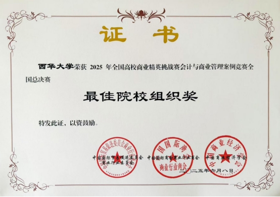 在近日结束的2025年全国高校商业精英挑战赛-会计与商业管理案例竞赛全国总决赛中,我校学子喜获佳绩,共有5支团队获得全国一等奖(本科组4支、研究生组1支),11支团队获得全国二等奖(本科组6支、研究生组5支),3支团队获得全国三等奖(本科组2支、研究生组1支),总计19支团队获得全国奖项的好成绩(获奖名单如下)。同时,西华大学获得了全国总决赛最佳院校组织奖。我校有2支全国一等奖团队获得了精英赛参赛资格,在管理学院高洁老师指导下,2022级财会专业本科生岳莉君、刘佳奇和邓晓妤代表西华大学参加了在河南省三门峡市举行的精英赛,这也是本校同学参加此项比赛以来的重要突破。