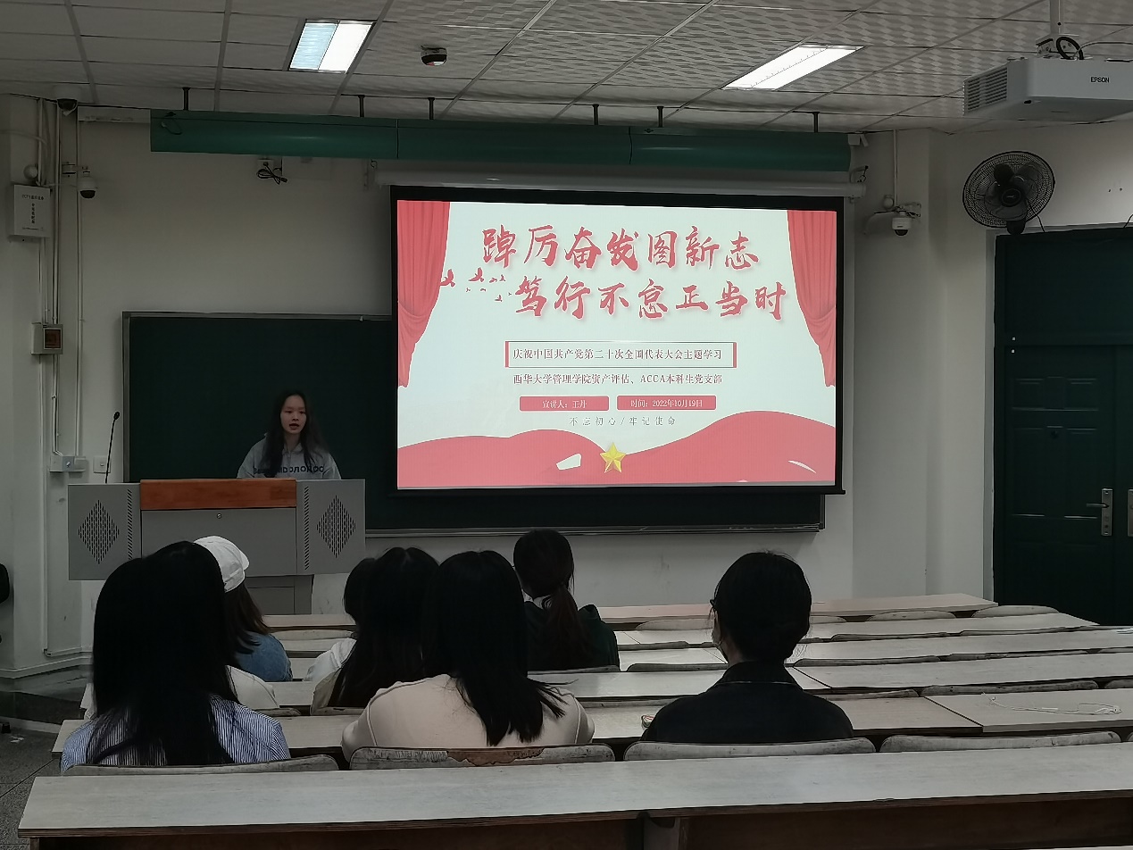 2022年10月19日上午9:00,管理学院资产评估、ACCA本科生党支部于3B-302成功召开以“踔厉奋发图新志,笃行不怠正当时——学习党的二十大”为主题的十月第一次党组织生活会,此次组织生活由王丹同志主持。